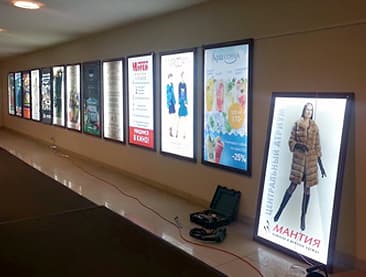 Световой короб с клик профилем относится к востребованным среди предпринимателей информационным носителям. Наиболее часто такие конструкции используются в местах, где требуется часто менять рекламные изображения (афиши, расписания, меню, плакаты):